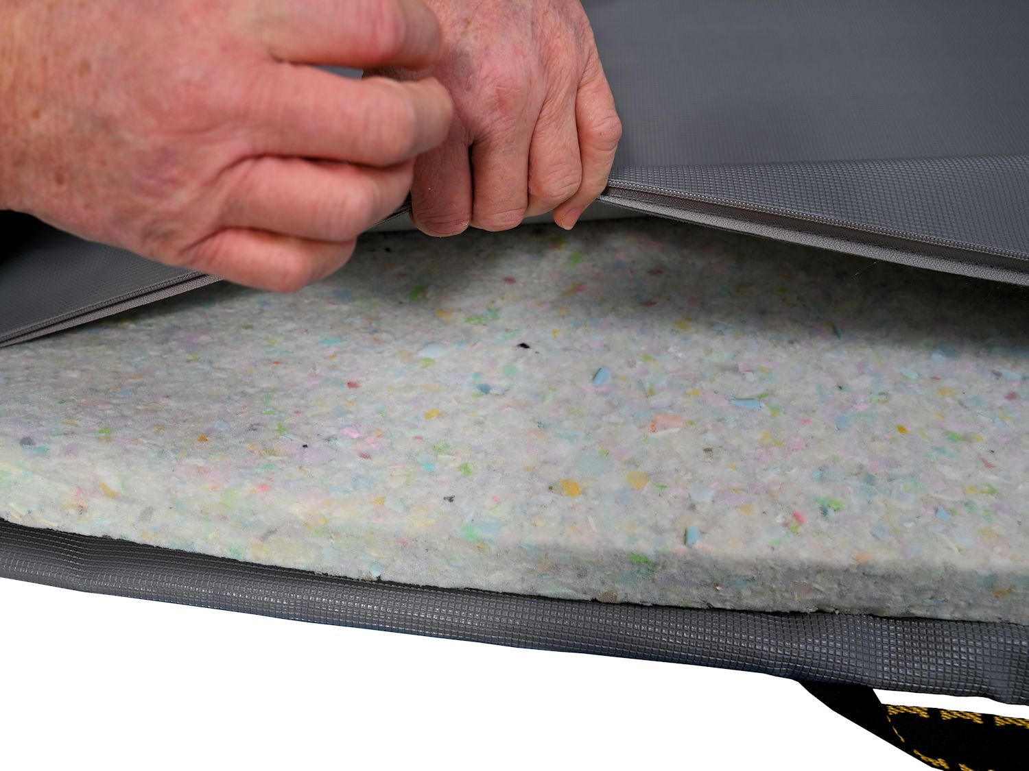 Bei der Variante mit 3 cm Stärke befindet sich der Reißverschluss geschützt auf der Unterseite – somit ist er beim Einsatz unsichtbar. Diese Ausführung verfügt über zwei Tragegriffe an den kurzen Seiten, wodurch die Matte bequem gefaltet und transportiert werden kann.