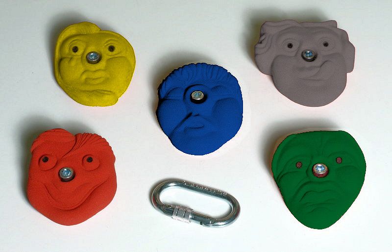 Kinderklettergriffe, mit lustigen Gesichtern, die verschiedene "Emotionen" zeigen - maßgeschneidert auf die besonderen ergonomischen Anforderungen von Kinderhänden. Die Klettergriffe sind lebensmittelunbedenklich und speichelfest gemäß Lebensmittel- und Bedarfsgegenständegesetzes §5Abs.1.Nr.1 - was gerade für Kinder, die eng mit den Klettergriffen in Kontakt kommen von großer Bedeutung ist.