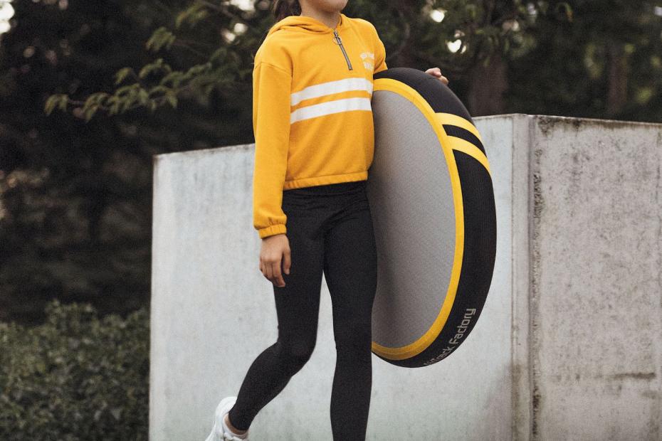 Im Inneren der Airtrack Factory Produkte halten Millionen Polyesterfäden des Doppelwand-Gewebes nach dem Befüllen Ober- und Unterseite auf Spannung. Dadurch bleibt die Oberfläche tischeben und hat eine konstante Höhe.